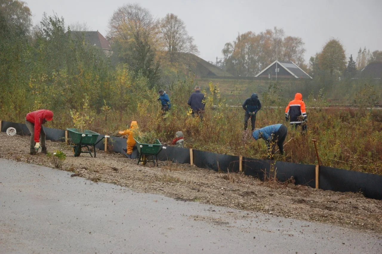 15 Vrijwilligers hebben zich zaterdag niet laten ontmoedigen door de regen en staan om half 10 met spades en kruiwagens klaar op het terrein van de Overtuin in Arkel. Terwijl de aannemer in de startblokken staat om te beginnen met bouwen op dit voormalige fabrieksterrein, worden honderden zaailingen uitgespit om elders geplant te worden. Zo wordt voorkomen dat de boompjes bij het bouwklaar maken van het terrein onder de shovel verdwijnen. Op het terrein staat een grote diversiteit aan boompjes en struiken. Die zijn daar gekomen doordat jaren geleden grond van elders uit het land hier werd opgebracht om het terrein te verhogen. In die grond zaten allerlei zaden die ontkiemd zijn.