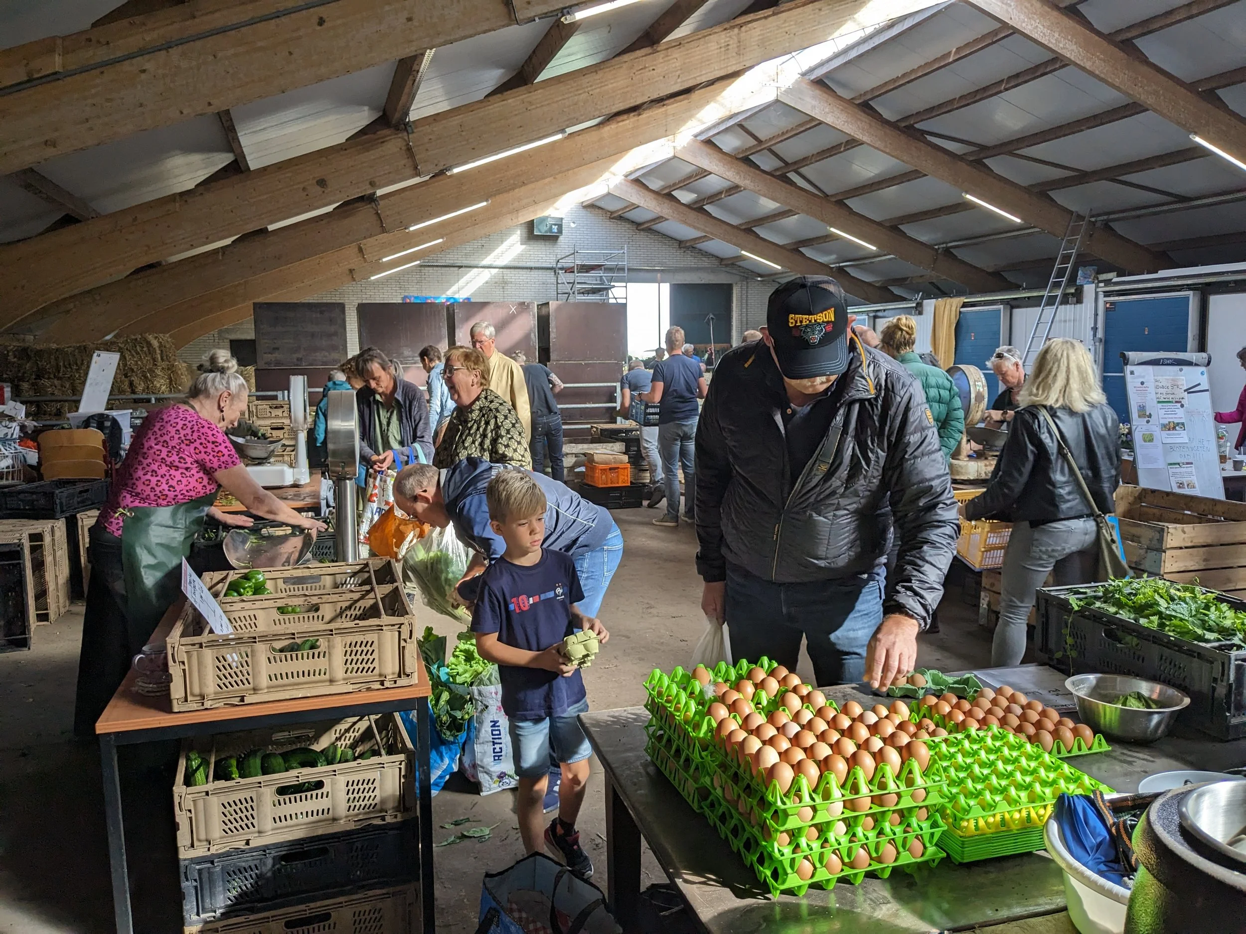 De excursie van zaterdag had tot doel een concreet beeld te krijgen van een Herenboerderij en alles wat erbij komt kijken om die op te richten. We kregen een rondleiding van 2 bestuursleden van de coöperatie. We troffen het: Het was “afhaaldag”. Alle leden van de coöperatie kwamen hun wekelijkse boodschappen halen. We waren zeer onder de indruk van de gezellige bedrijvigheid en het enorme aanbod van groente, fruit, eieren en vlees in de grote loods op het terrein. Dit was vroeger een stal voor veel koeien.