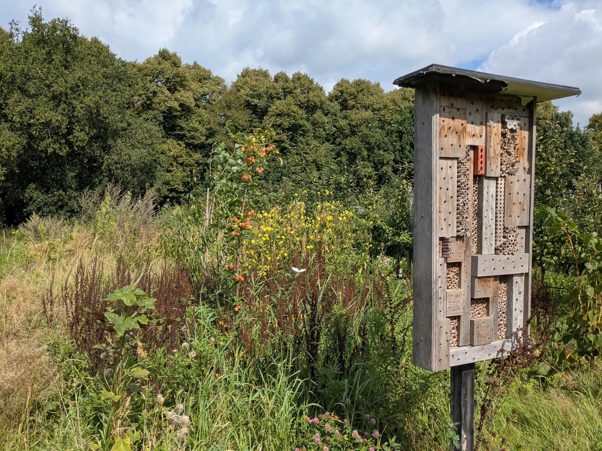 Dan is het 10 minuten lopen over de weg naar een ander veld, dat prachtig omsloten door hoge bomen een eindje verderop ligt. Dat sluit aan bij een Natuur-educatiecentrum van het IVN. Op dit veld staan 2000 fruitbomen , vooral appels en peren van tientallen verschillende soorten. Dit laatste om ervoor te zorgen dat het seizoen zo lang mogelijk gespreid wordt: Van juli tot oktober. Er is gekozen voor laagstam, omdat er dan sneller oogst is voor iedereen. Het streven is om dagelijks voor iedereen 1 stuks fruit te produceren.