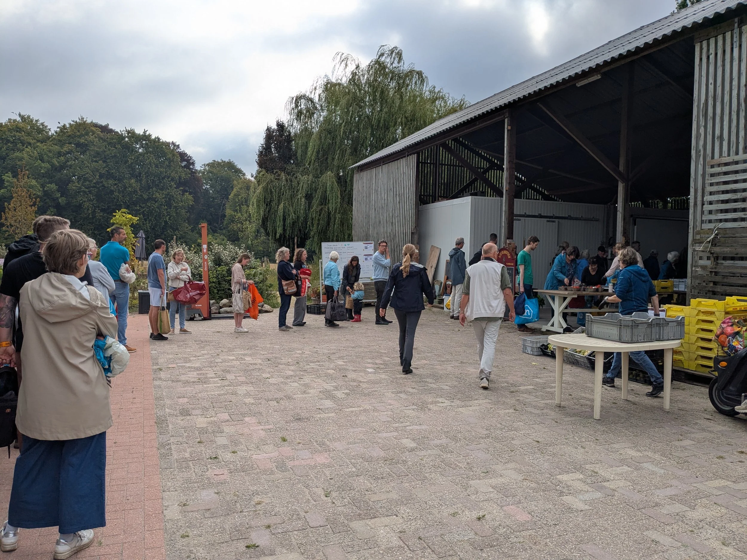 Het is “uitgiftedag” Leden staan in de rij voor het oogst-aandeel en gaan met grote tassen vol naar huis.