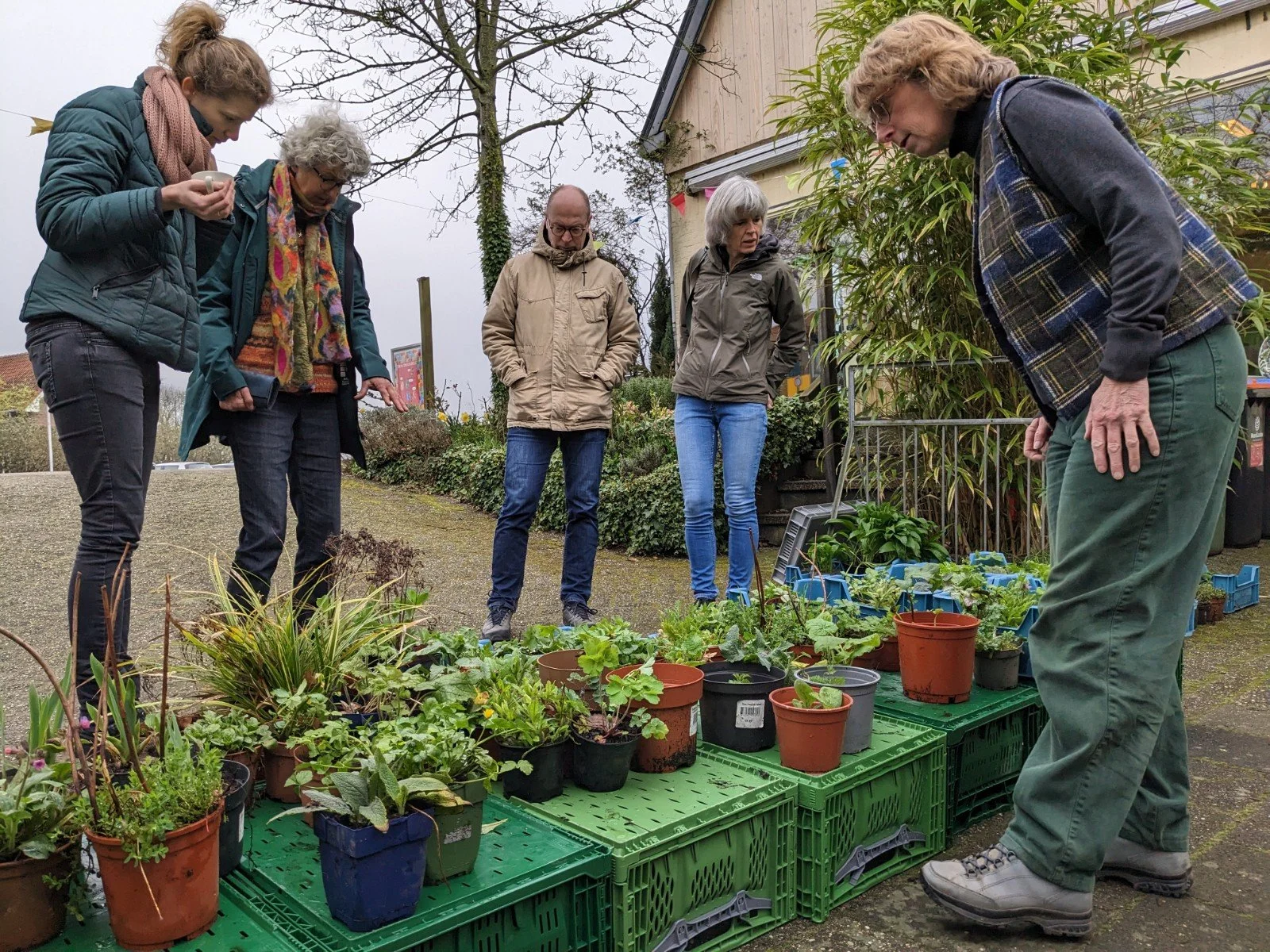 ’s Morgens was onze hele verzameling van meer dan 300 plantjes al bijna geheel uitverkocht. Om mensen niet teleur te stellen hebben we nog snel extra plantjes uitgespit. Vooral de daslook, de sneeuwklokjes en het longkruid waren zeer in trek. Alle tomatenplanten en aardbeienplanten waren ook snel op. Veel mensen kwamen bewust deze plantjes kopen omdat ze “echte planten” wilden die natuurlijk gegroeid zijn en waar geen chemische middelen bij gebruikt zijn.