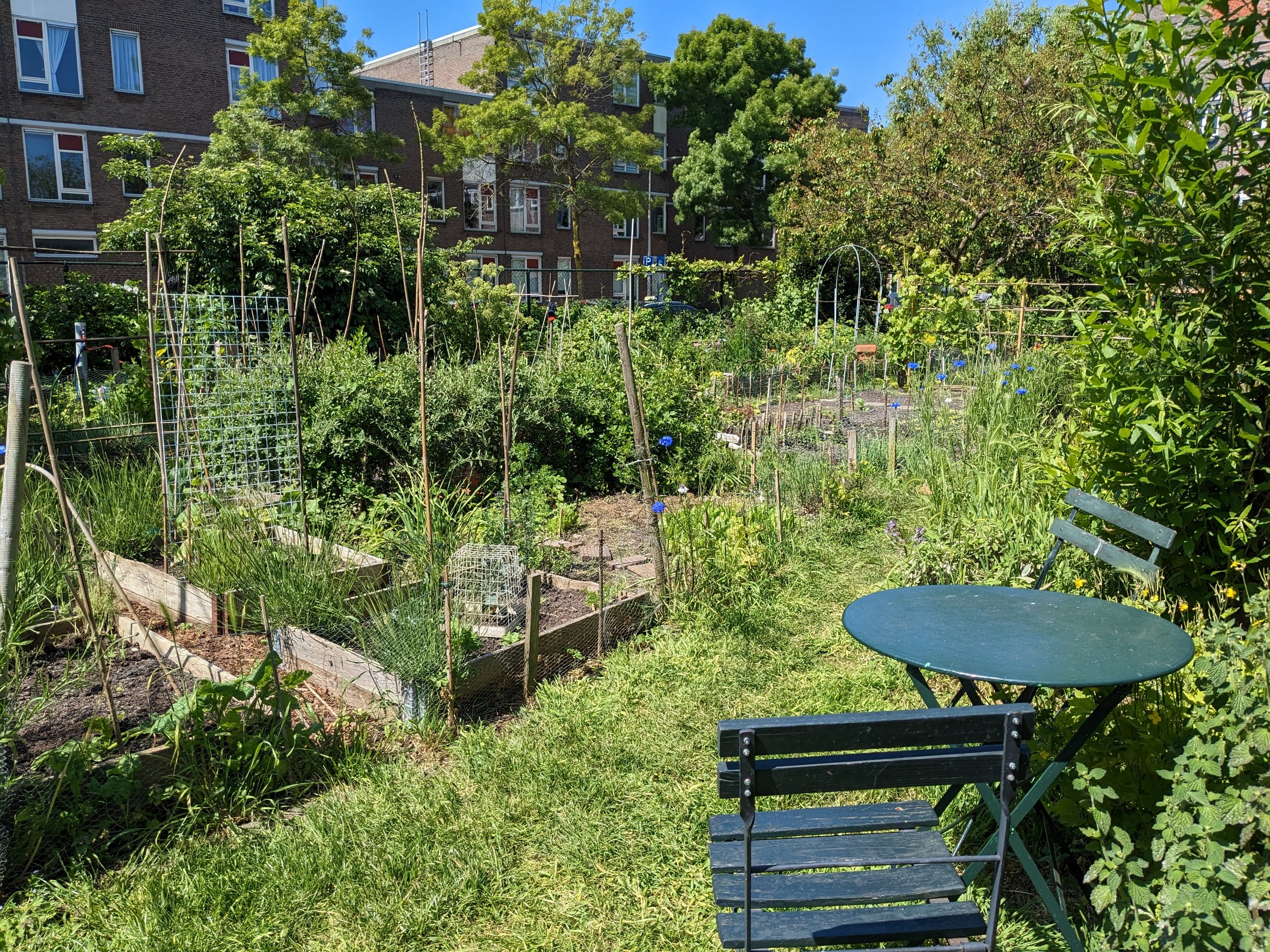 Het verhaal is prachtig: Tot een paar jaar geleden was hier een treurige parkeerplaats waar allemaal dingen gebeurden waar buurtbewoners niet blij van werden. Natuurlijk waren er projectontwikkelaars met snode plannen. De buurt heeft daar echter een stokje voor gestoken. Met elkaar hebben de omwonenden, jong en oud, met zeer diverse culturele achtergrond, de tuin aangelegd met als doel……..